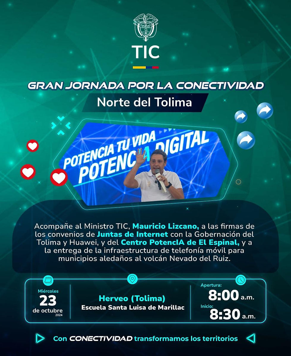 Este miércoles, 23 de octubre, el ministro de Tecnologías de la Información y las Comunicaciones de Colombia, Mauricio Lizcano, estará en el Departamento del Tolima liderando la denominada Gran Jornada por la Conectividad. Primero, el MInTic visitará el municipio de Herveo donde firmará convenios de Juntas de Internet y del Centro PotencIA de El Espinal; además, entregará infraestructura para los municipios aledaños al volcán Nevado del Ruiz.